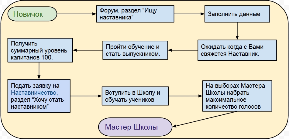 Игрок, который достиг суммарного 100 уровня капитанами может стать Наставником в Школе и получать приятные бонусы за обучение новичков. Лучшие наставники Школы будут получать помимо бонуса за выпущенных учеников - премиум аккаунт на 1 месяц.