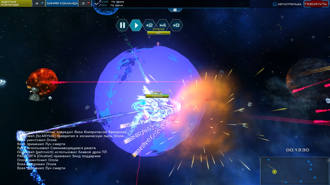 Также, как и в предыдущем пункте наносим урон по боссу. Если вдруг так получилось, что босс телепортировался или Вы подлетели к нему близко, и босс активировал луч смерти или выпустил залпами боеприпасы - без паники, выпускаем вперед силовую преграду и отражаем потенциальный урон. Далее отлетаем от босса и добиваем его.